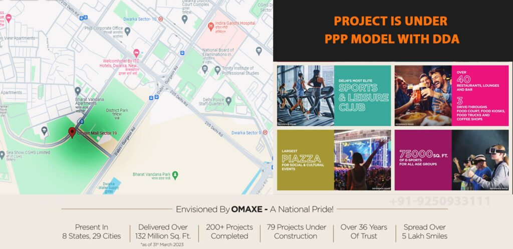 Omaxe Project Dwarka spans 50.4 acres and is located in Sector 19B Dwarka New Delhi, situated on the Dabri- Gurgaon Road near Welcome Hotel by ITC. The Omaxe State is introducing a world-class Sports Complex commercial project under ppp model with dda. Name of Omaxe dda Project Dwarka is ‘THE OMAXE STATE‘, located at Dwarka Sector 19B. Omaxe DDA shops dwarka 19B is going to be a game changer in the retail landscape. Investing in Omaxe Mall Sector 19B Dwarka Delhi, Omaxe Dwarka Project offers the potential for 12% high returns, thanks to its well-rounded development strategy, prime location, and commitment to aesthetics. With its modern architecture & an array of iconic brands. Spanned across a large area of 50.4 acres, Omaxe Developer is developing a world-class sports city along with a premium commercial complex, clubs and a 5-star hotel facility with 2500 parking facilities. The sports facility will be operated by a world-class sport management company, club and hotel will be managed by one of the best hotel brands in the World.